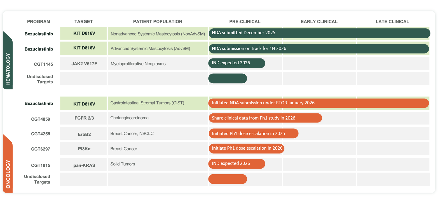 We strive to develop innovative therapies by strategically focusing on genetically defined diseases. Our clinical pipeline is focused on bezuclastinib, a highly selective and potent KIT inhibitor with the potential to provide real solutions for patients. Our research pipeline leverages our world-class research and development team to advance our preclinical assets.